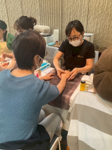 参加者の方と会話をしながらハンドケアを行うことで、体だけでなく心もほぐれ、施術するセラピスト側も癒しのひと時となりました。