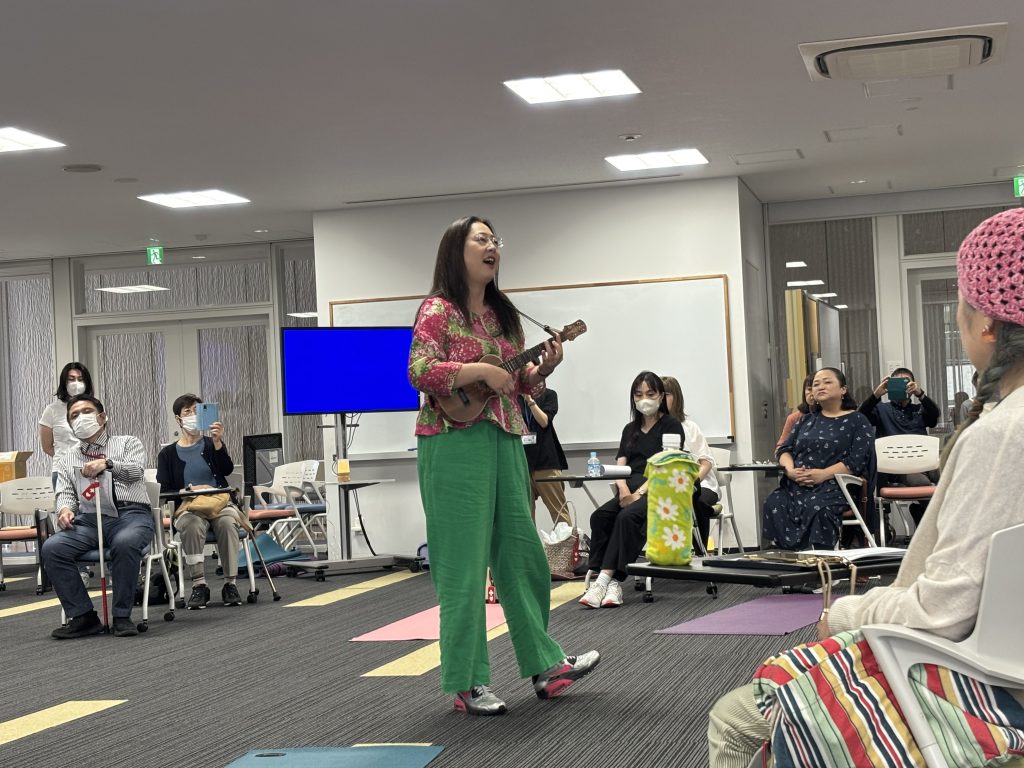 音楽療法士でありウクレレ奏者のリナリナさんによる歌とウクレレの演奏は、会場の真ん中で行いました。